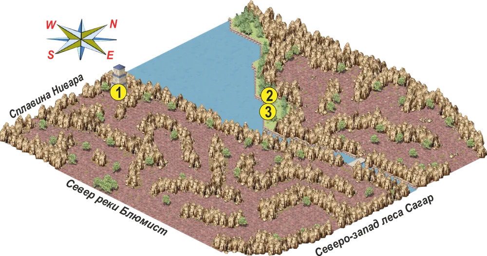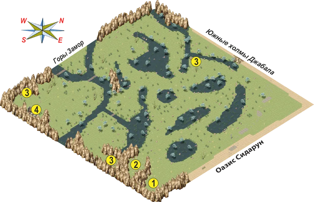 1 – лагерь вароннари. 2 – логово болотных падальщиков. 3 – становище троллей. 4 – вход в пещеру Гургута.