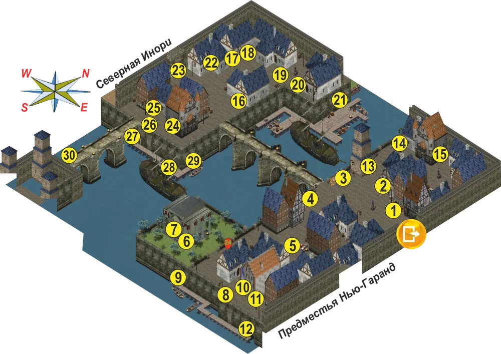 1 – алхимик Тулл. 2 – таверна «Имперский приют». 3 – бронник Флойд. 4 – торговец Джетро. 5 – брат Габриэль. 6 – сэр Эндрю Мейсон. 7 – храм. 8 – вход в доки. 9 – Уотерс. 10 – ратуша. 11 – Фрита Рейадер. 12 – вход в канализацию. 13 – Гильдия воинов. 14 – изувеченный бродяга. 15 – дом Одо Штейнца. 16 – горожанин. 17 – Адаон (после освобождения). 18 – торговец Пинк. 19 – вход в доки. 20 – Гилмор. 21 – вход в канализацию. 22 – таверна «Зеленый рыцарь». 23 – выход в Северную Инори. 24 – великая библиотека Искателей знаний. 25 – Латимер. 26 – вход в доки. 27 – вход в канализацию. 28 – капитан Райт. 29 – лодочник Тиом. 30 – вход в замок.