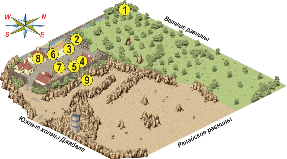 1 – вход в Ламтский лабиринт. 2 – Ордук из Соллига. 3 – торговец Уэлль. 4 – бронник Рея. 5 – Брегос Грейхэнд. 6 – ратуша. 7 – Силена. 8 – таверна «Ржавый тесак». 9 – отряд вараннари. 10 – башня Тремодана.