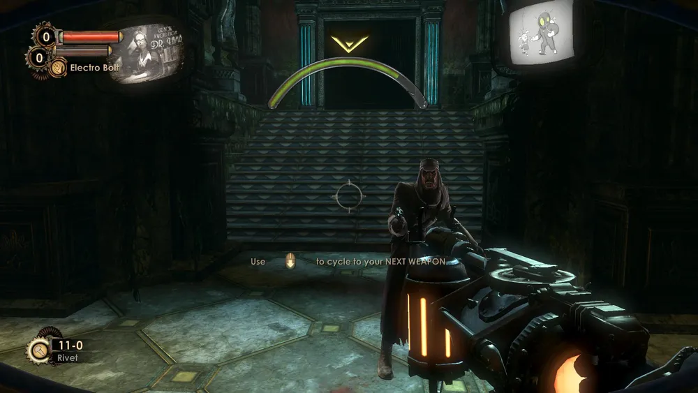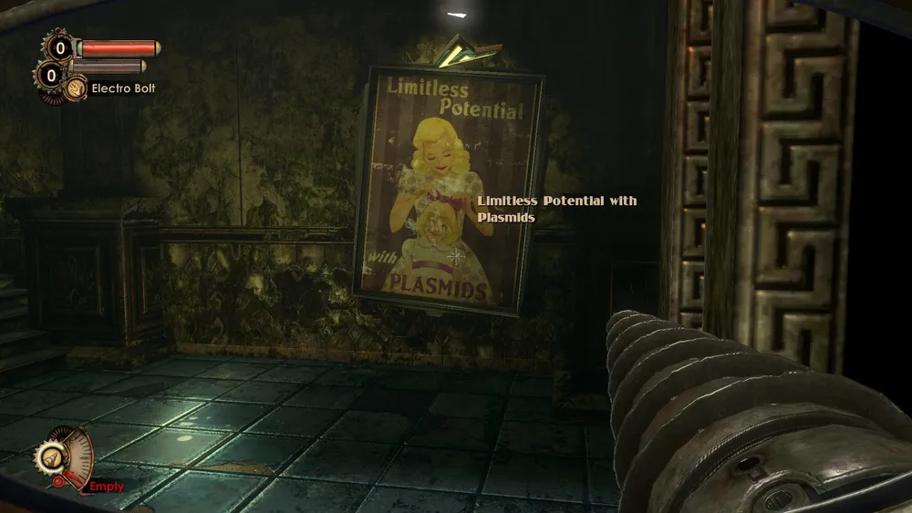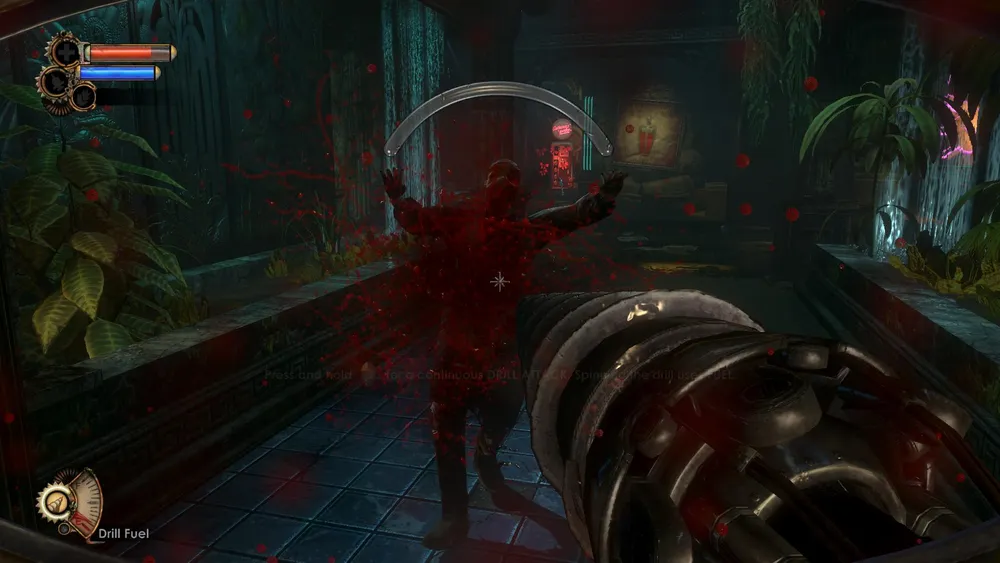 Однако на первых парах вторая часть мне слишком напоминает первую. Окружение не изменилось, общий стиль тот же. Даже бои отчасти похожи, поскольку мы используем магию и стреляем (да, не буром единым...). Ну и плюс все фишки оригинального BioShock остались: обыск трупов, комнатки, где можно просто чем-нибудь поживиться, магазины-автоматы.