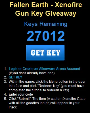 Для этого проходим по ссылке http://www.alienwarearena.com/giveaway/fallen-earth, регистрируемся на этом сайте. Затем нажимаем GET KEY и вуаля, нужный нам ключик.