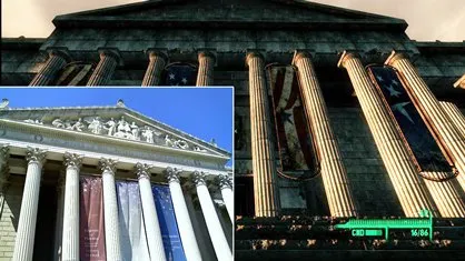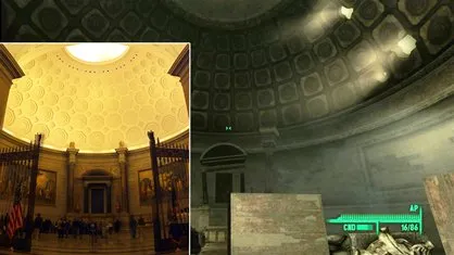 Внутри Национальных Архивов мы обнаруживаем ротонду Хартии Свободы – она содержит в себе Декларацию Независимости, Конституцию и Билль о Правах. По версии Fallout 3 все здесь немного в запущенном состоянии, но большинство мелких деталей на месте (даже пустые рамы на месте когда-то висевших картин).