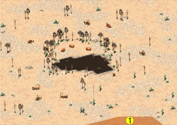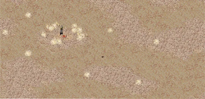Из дальнейшего разговора выяснится, что верховный вождь Джеронимо собрал воинов в пуэбло, чтобы дать отпор чужакам, но следопыт считает это опрометчивым поступком. Дело в том, что недавно следопыт вернулся с одного из водопоев, где он видел множество огромных пустынных скорпионов, которые мешают браминам и пастухам подойти к воде. Следопыт пытался собрать отряд, чтобы избавиться от монстров, но вождь запретил уводить воинов из пуэбло без крайней необходимости. Предложите следопыту свою помощь, а затем попросите показать дорогу к этому водопою. Вы переместитесь в нужную локацию.