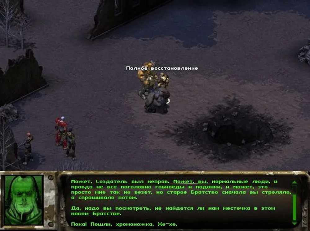 И наконец — фанфары! — Pip-Boy. Точнее, даже два. Который из них окажется у вас в отряде, зависит от количества наёмников, вас сопровождающих. Если в отряде четверо бойцов, включая главного героя, Pip-Boy вступит в отряд немедленно, прямо на локации.