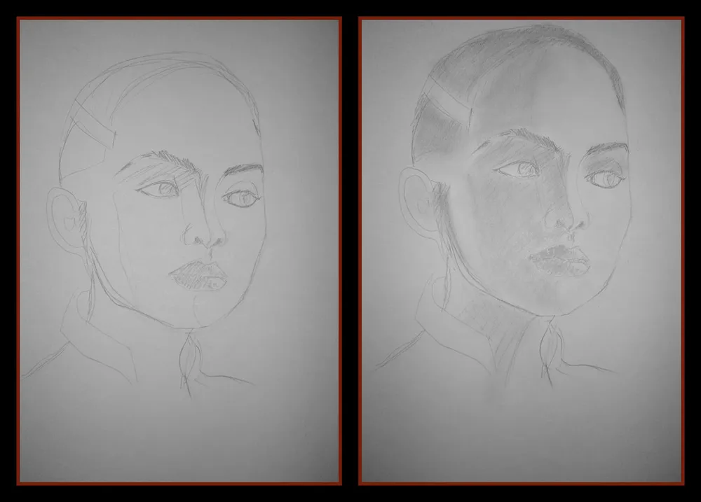 Первые два этапа - эскиз и набросок теней.