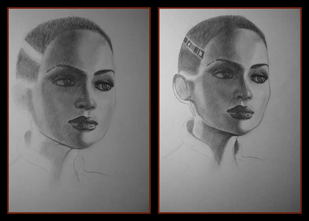 Я набрасываю контуры татуировок и штрихую их. Потом растушевываю карандаш в области "прически" героини и обвожу контур лица. Это мне потребуется для дальнейших манипуляций с рисунком, но вообще, как я уже говорила, контуров следует избегать. Дело в том, что фон я планирую сделать простым и черным, но штриховать это карандашом - забодаетесь, лучше углем. А поскольку угля у меня нету, я буду выкручиваться Photoshop'ом. Для того и нужен контур. Впрочем, если бы вы рисовали фон углем, контур лица вряд ли бы вам помешал.