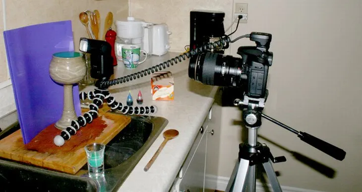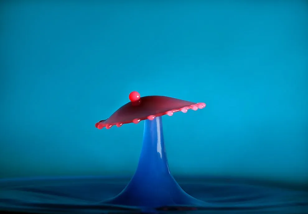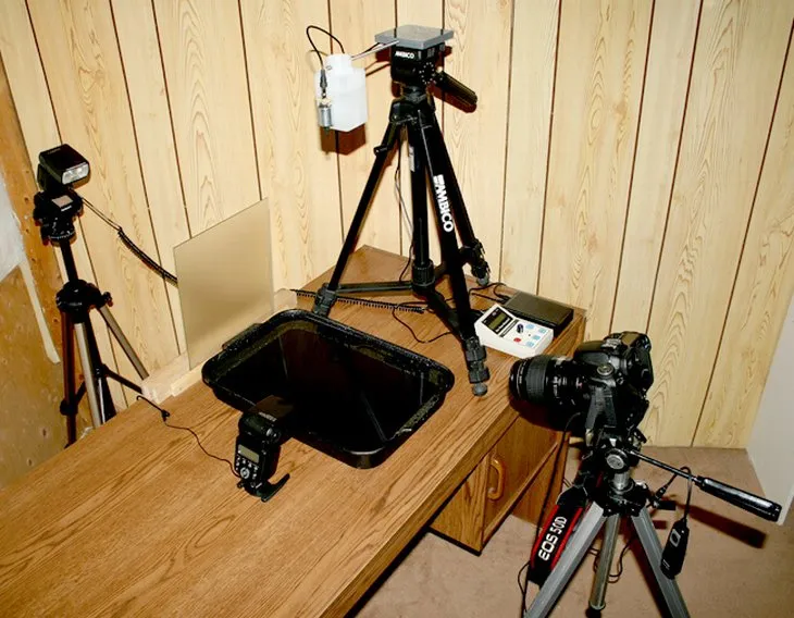 Это полностью ручная установка, здесь используется вспышка, фотоаппарат, обычная пипетка, которая и есть центральным производителем капель, и любые виды емкостей с водой. Это могут быть и бокалы, и кружки, и миски, и даже кастрюли :) но с временем, Корри усовершенствовал свою машину исскуства, и добавил автоматическую капельницу)