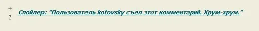 Съесть комментарий - пользователь съедает неугодный комментарий: весь текст прячется под спойлер. Если случайно съесть комментарий заовцованного пользователя, то можно подцепить овечье бешенство. Чужие объедки есть нельзя. Доступно с 27 уровня за 1000 энергии.