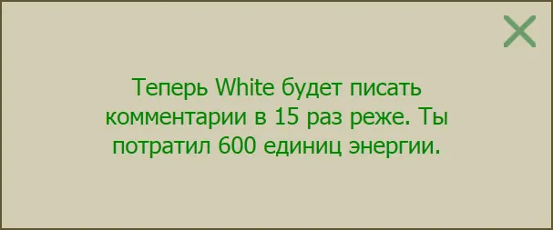 Улитизация - в течение суток улитизированный пользователь сможет писать комментарии не чаще, чем раз в 15 минут. В качестве бонуса прилагается очаровательная аватарка. Дешевле затычки и позволяет приструнить словоохотливого тролля. Доступно с 28 уровня за 600 энергии.