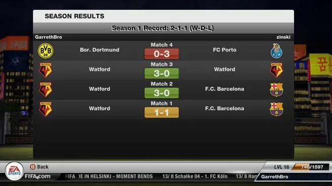 В FIFA 12 все по-другому! Идея проста: игра дает возможность быстро сразиться с друзьями по сети, но при этом результаты фиксируются, и поэтому все куда больше похоже на настоящий футбол. В левой части экрана слева находится список ваших друзей. Выберите соперника, затем уточните параметры - и начинайте играть. Вся прелесть заключается в том, что каждый товарищеский матч как бы становится сезоном. Здесь, как и в "Сезонах", у вас есть 10 матчей, а цель игры – набрать больше очков, чем ваш друг. Если после 10-го матча у сторон равенство очков, мы учитываем даже разницу мячей. Выбрать любимый клуб, одолеть друга в финальном матче и завоевать трофей – что может быть лучше?