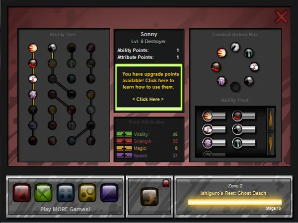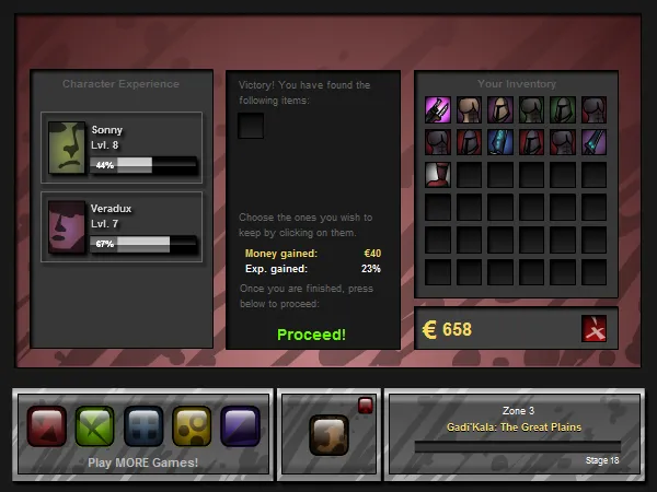 Крайне популярная бесплатная ролевая флеш игра "Sonny" - проходите бои в качестве ясноглазого зеленого мутанта. Изначально герой оказывается на корабле: в походовых боях вам противостоят красные пираты online RPG. Купить оружие и броню можно у торговца флешки. Доступно дерево способностей и развитие параметров персонажа – в ролевой игре Sonny RPG вам остается только найти оптимальную комбинацию оных и победить врагов. Там же можно выучить заклинания. Яркий представитель раздела "бесплатные ролевые игры, online RPG игры".