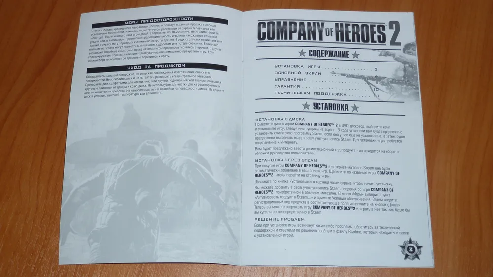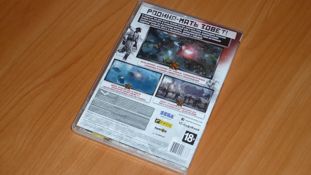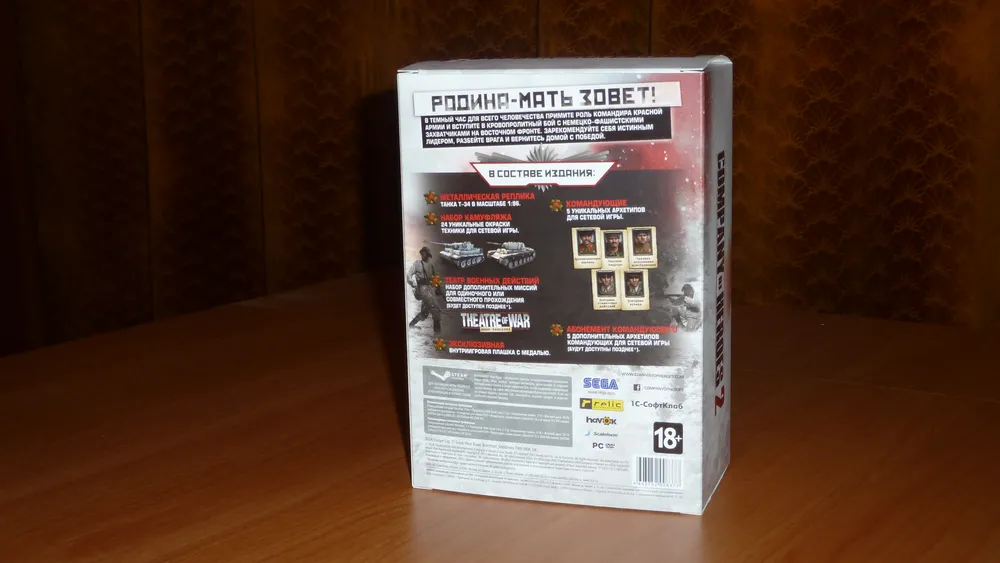 Коробка выглядит довольно красиво со всех сторон. Спереди есть специальное окошечко, через которое можно увидеть изюминку данного издания - металлическую модель танка из игры Company of Heroes 2 на фоне кровавого сражения российских солдат и фрицев. Название игры, кстати, со всех сторон написано рельефными буквами - выглядит очень красиво. Чуть ниже окошечка присутствуют различные логотипы: издателя, разработчика, надпись "18+ запрещено для детей" и приведены несколько мнений об игре от игровых сайтов: