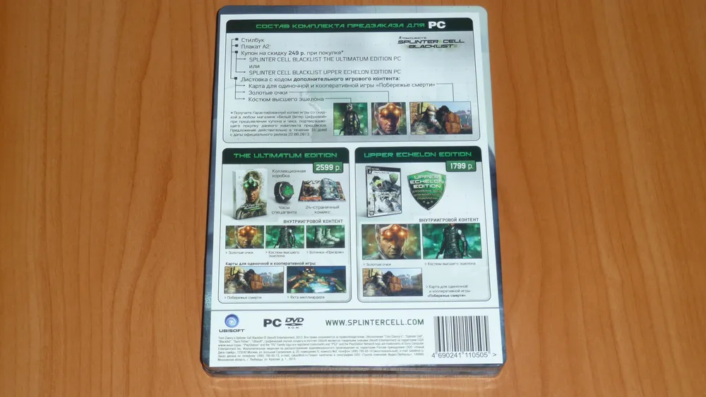 Поступила данная коробочка в продажу совсем недавно и продается она только в магазине Белый Ветер Цифровой. К сожалению, в этом магазине будут продаваться только Upper Echelon Edition (расширенное издание в двд боксе) и The Ultimatum Edition (коллекционное издание с часами), а вот The 5th Freedom Edition (коллекционное издание с фигуркой Сэма Фишера) будет продаваться только в магазине 1С Интерес.