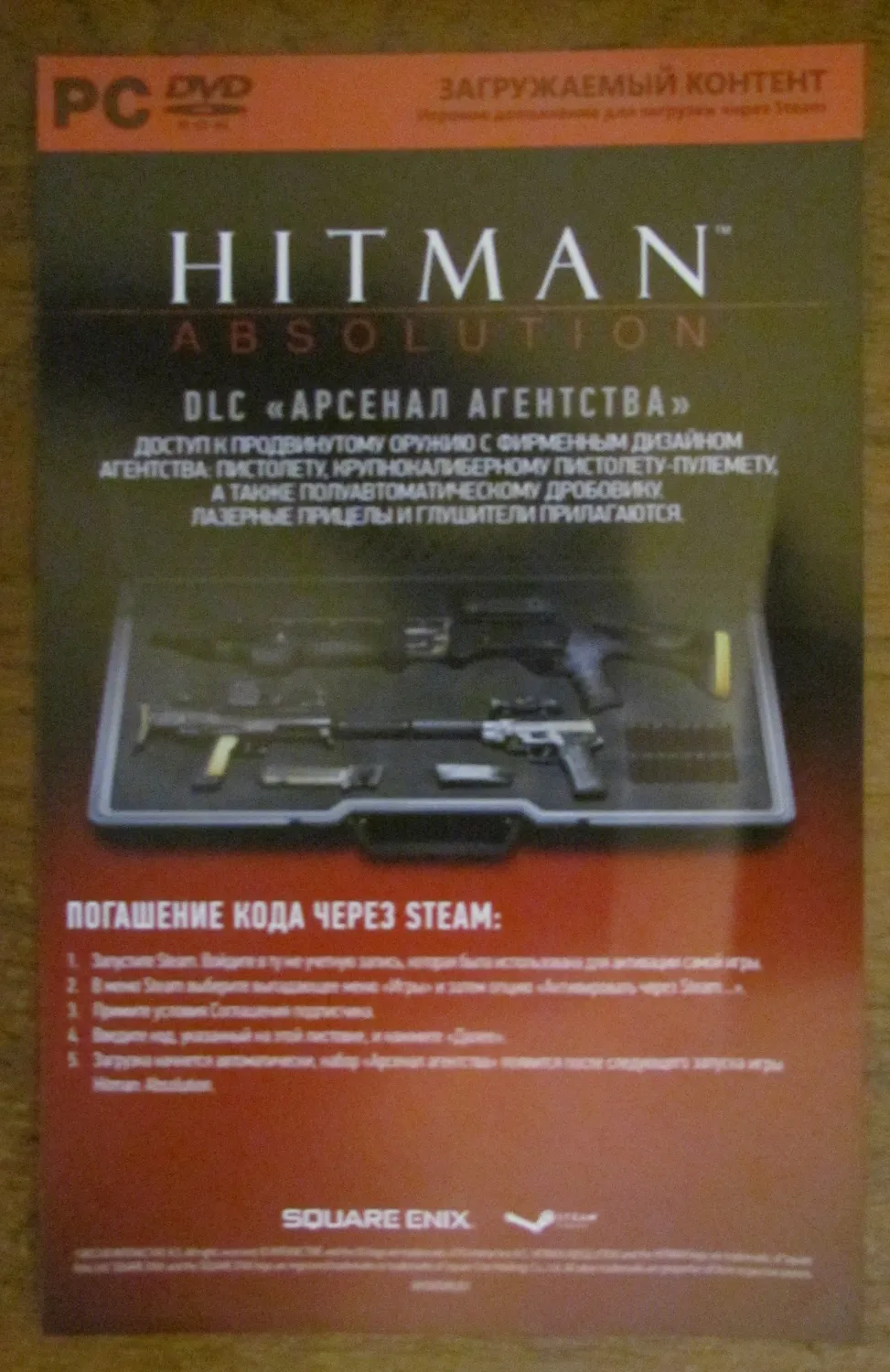 Листочек с кодом для DLC "Арсенал агентства", включающий в себя: пистолет, крупнокалиберный пистолет-пулемет и полуавтоматический дробовик. К ним также прилагаются глушители и лазерные прицелы.
