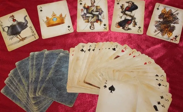 Внутри находятся колода карт с персонажами из игры и двухсторонняя монета для "решения трудных задач" в виде символа, изображенного на обратной стороне игральной карты. Сами карты сделаны из картона, довольно плотные, да и не для игры я их покупал, а для коллекции)