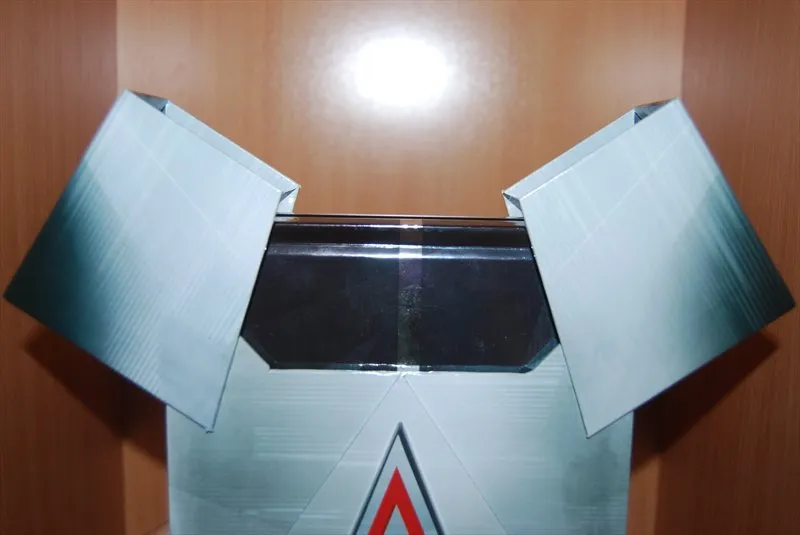 Сама коробка сделана из добротного пластика, не разваливается. При передвижении знака ассассинов вверх, 2 половины крышки коробки раскрываются.