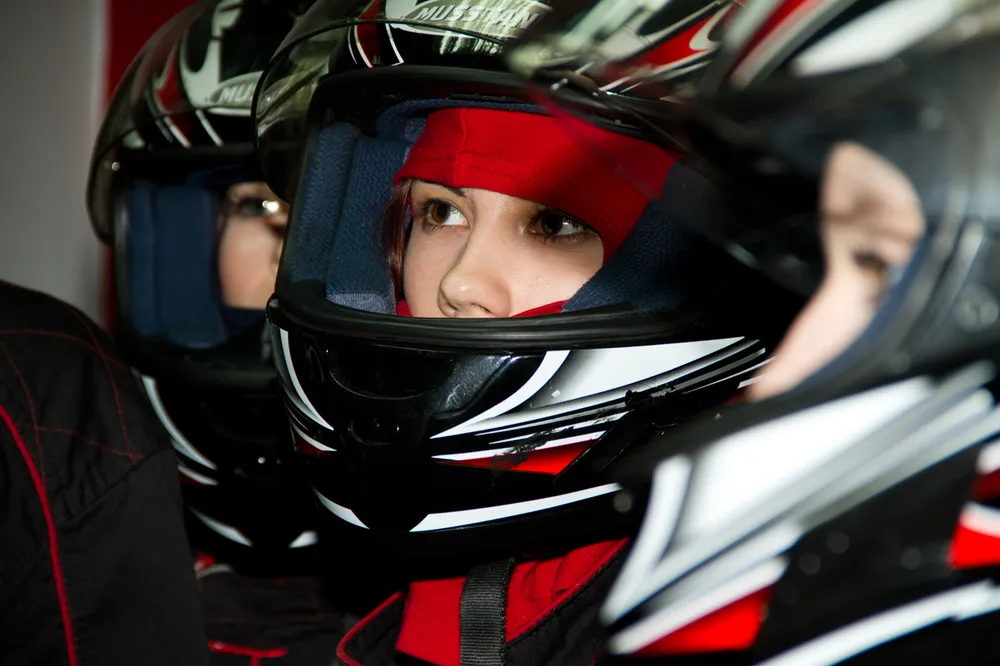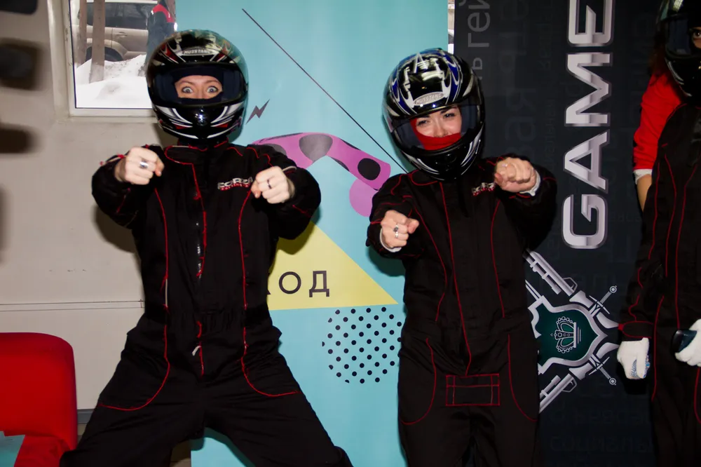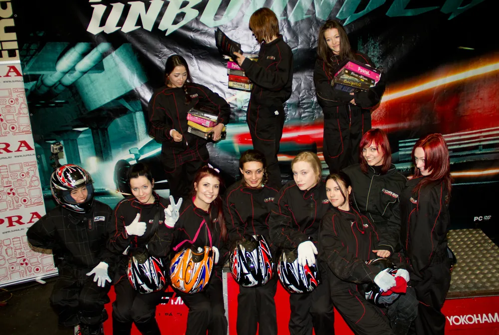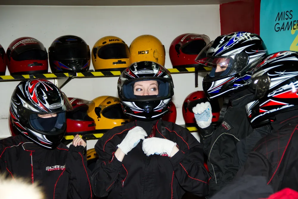 Дальше были запланированы развлечения - картинг! Я никогда раньше не каталась, да и остальные девушки тоже. Так что все мы были на равных, нам предстояла настоящая гонка! Напялив на себя все обмундирование, в том числе и шлемы, мы не могли привыкнуть к своим новым габаритам(голов) и то и дело друг об друга трескались :)) Нам провели небольшой интсруктаж, который в основном сводился к тому, чтобы объяснить значение цветов флагов, которыми нам будут подавать сигналы. Например синий - уступи дорогу, желтый - осторожно, на трассе опасная ситуация и т.д.