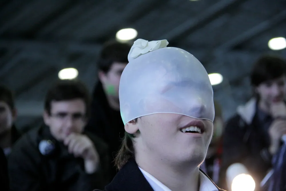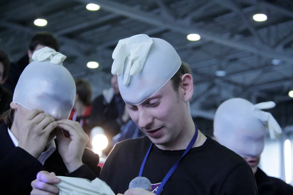 Было так: "<Имя> <Фамилия>, Игромания". После этого он просто стоит и молчит. Кто-то из отвечавших на вопросы сказал "Очень приятно", после этого зал и понесло.