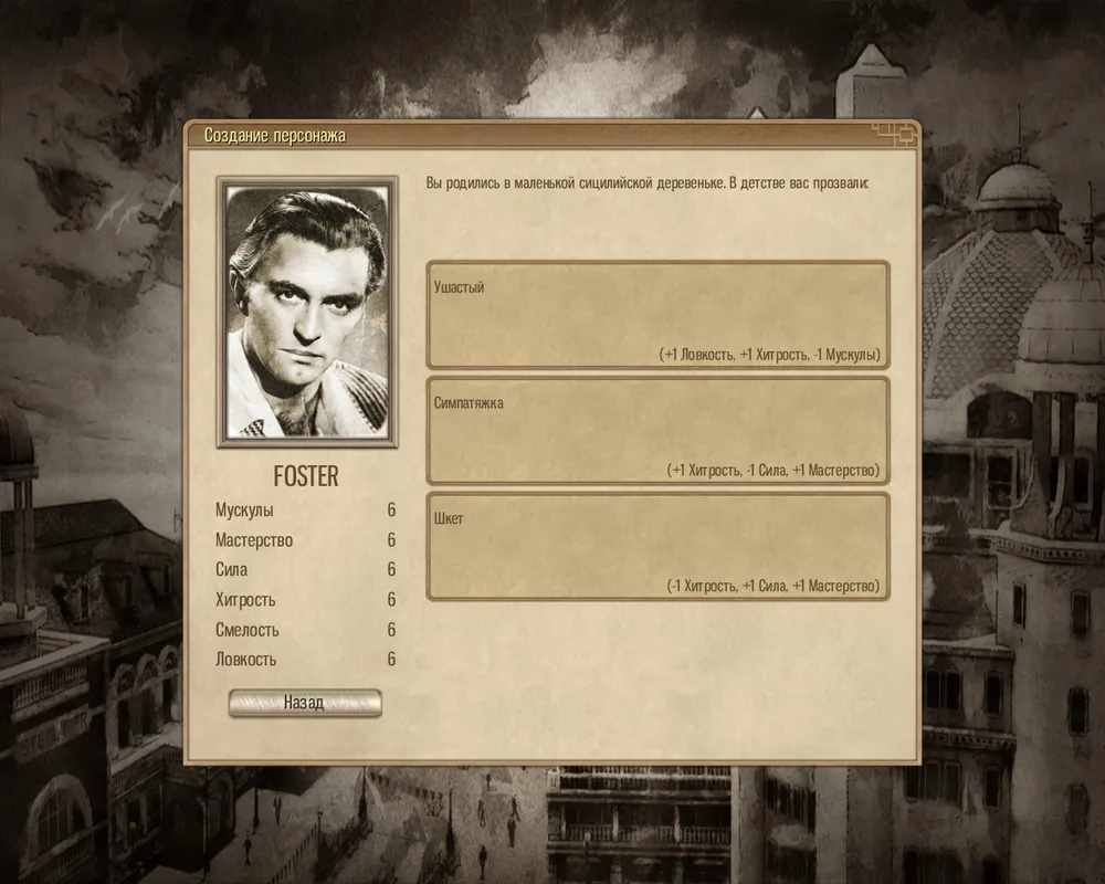 Для создания персонажа выбрали не банальное распределение очков по атрибутам, а выписывание своей истории посредством выбора из трех возможных вариантов. Конечно, я довольно долго размышлял над тем фактом, что, оказывается, все ушастые ребята — ловкачи и хитрецы, а любой симпатяжка — специалист по огнестрельному вооружению ("мастерство" именно за него и отвечает), но все же, горестно вздохнув, продолжил генерировать жизненный путь персонажа.