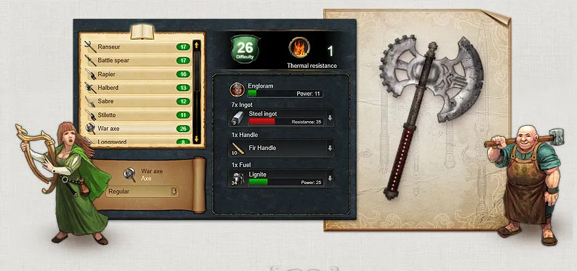 «Давайте для примера рассмотрим создание щита, - говорит разработчик Франсуа. – Я кузнец и хочу создать боевой щит. Его можно сделать из стали, а можно из бронзы. В зависимости от выбранного материала создание предмета будет проще или сложней, и, конечно, это повлияет на характеристики щита в бою. Я даже могу сделать щит из золота, в бою он будет неэффективным, но зато возрастет престиж персонажа».