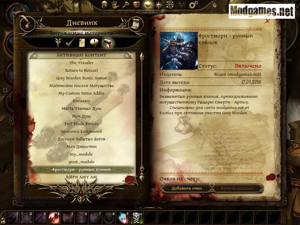 Ура, товарищи! Мы сделали это - плод долгих часов работы - теперь в Dragon Age! Тот самый Фростморн из вселенной Warcraft, модель котого взята и конвертирована из всем известной игры Oblivion, может легко стать вашим в Dragon Age. Меч в двуручном и одноручном варианте появится у вас в инвентаре после установки плагина.