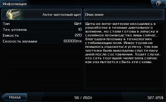 Для сравнения: лучший из имеющихся в свободной продаже щитов Beamshield II имеет емкость в 150 единиц и скорость зарядки 45,000ms. Зарядка медленнее, но, поверьте, в игре вы не ощутите эти 15,000ms совсем, а 70 единиц емкости щита в бою имеют большое значение. С другой стороны, ресурсов «Анти-матерный щит» требует немало, одних только «Нанотрубок» необходимо больше чем на 20,000 кредитов.