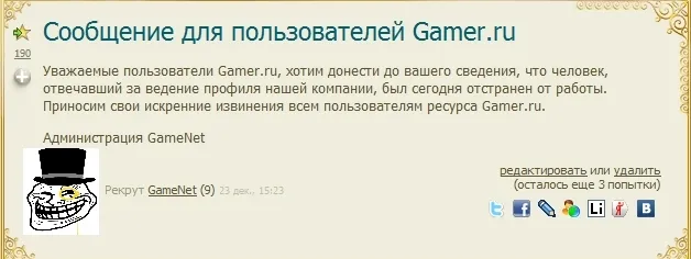 Эту неделю на Gamer.ru скучной не назовешь, было все: революция, контрреволюция, репрессии, народные волнения, сходки, протесты, плакаты, агитация, даже пострадавшие есть. Мне все понравилось, вы молодцы. На этом Геймнет прощается с вами в этом году. Не обижайте маленьких праний, им всего день осталось здесь жить.
