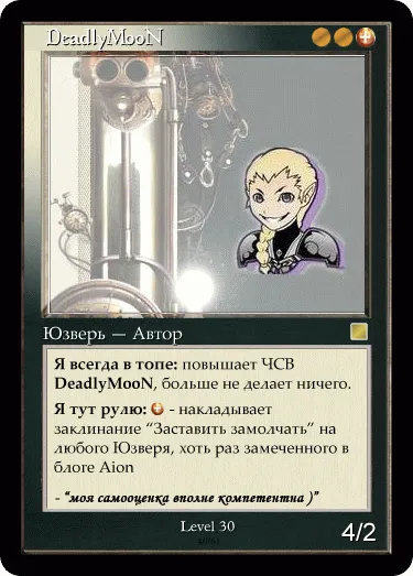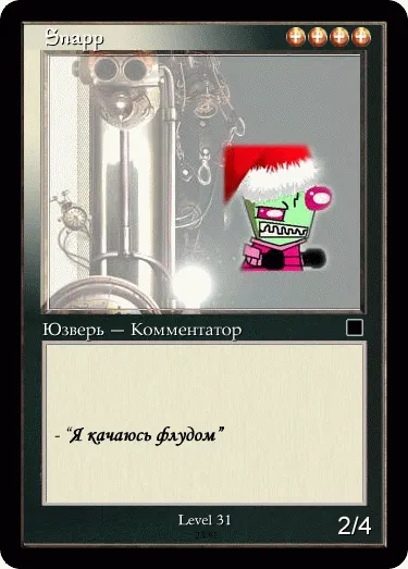 Редактировать пост тоже не дает, так что название попрошу поменять потом администрацию. Можно ругаться и восхищаться, кому что больше покатит. Вступление. Добро пожаловать в игру Gamer: the Gathering, лучшую в мире коллекционную карточную игру. Эта игра первая на портале и навсегда останется самой лучшей и самой масштабной. В игре Gamer: the Gathering игроки становятся мироходцами — могущественными магами, которые сражаются друг с другом за славу, знания и победу. Ваше оружие — это колода карт. В ней находятся все известные вам заклинания, а также пользователи, которых можно призвать для участия в битве. В играх с коллекционными картами, к которым относится и Gamer: the Gathering, одновременно сочетаются и интерес коллекционирования и стратегическая игра. Но здесь не будет никаких стремных бустеров с неизвестным содержанием, и вам достаточно иметь цветной принтер, чтобы получить нужные карты. Самое увлекательное в игре с коллекционными картами — это то, что она непрерывно изменяется. Вы сможете сами придумывать и добавлять собственные карты. Каждая игра в GTG не похожа на предыдущие. Если я не буду лениться, то несколько раз в году будут выходить новые дополнения к игре Gamer, в которых постоянно будут появляться новые возможности ошеломить и победить оппонентов. Основы. В настоящей редакции будет всего 4 типа «маны» - оценок, дающих вам возможность играть имеющиеся у Вас карты. Для получения оценок достаточно повернуть соответствующую карту. Типы карт. Каждая карта GTG относится к одному или нескольким типам. Тип карты определяет, когда эту карту можно разыгрывать и что с ней после этого происходит. Заклинание Это своего рода магическая формула. Вы можете разыгрывать заклинания только во время главной фазы вашего собственного хода. Для применения Заклинание требует наличия на столе Юзверя соответствующего уровня. Если в стеке находится какое-либо другое заклинание, разыграть волшебство нельзя. (О фазах и стеке будет рассказано немного позже). Волшебство дает эффект (другими словами, вы выполняете указанные на карте действия), после чего отправляется в бан (этим термином обозначается стопка отыгравших карт). Мгновенное заклинание Мгновенные заклинания похожи на обычные заклинания, но их можно разыгрывать практически в любое удобное для вас время, даже во время хода оппонента и в ответ на другое заклинание. Как и заклинания волшебства, мгновенные заклинания дают эффект и отправляются в бан. Чары Чары — это устойчивое магическое воздействие. Чары относятся к категории перманентов. Это значит, что, во-первых, вы можете разыграть чары только при возможности разыгрывать заклинания волшебства, и, во-вторых, после разыгрывания чар вы кладете их перед собой, рядом с вашими плюсами. Теперь карта находится в игре. Любая карта в игре называется перманентом, поскольку она находится там постоянно (разумеется, до тех пор, пока не будет уничтожена). Артефакт Артефакт — это магический предмет. Как и чары, артефакты являются перманентами и после разыгрывания остаются в игре, оказывая влияние на ее развитие. Артефакты бесцветны, поэтому разыгрывать их можно независимо от того, какие у вас плюсы. Некоторые артефакты называются Снаряжением. Заплатив стоимость, вы можете прикрепить Снаряжение к Юзверю под вашим контролем, чтобы сделать его более сильным. Когда это существ