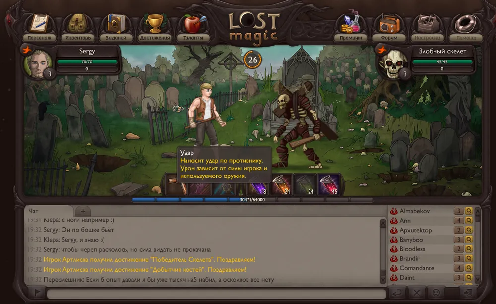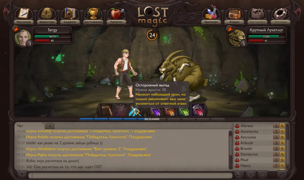 Из доступных мне способностей я чаще всего использовал fireball (огненный шар), привязанный к левой кнопке мыши из-за того, что его можно было применять достаточно часто. Для столкновений с большими группами монстров у меня была массовая, но долго кастующаяся атака, создающая порядочного размера сферу, которая, медленно продвигаясь вперед, наносит урон всем, кого коснется. У большинства магических атак есть своя дальность, поэтому необходимо было приблизиться к противнику на достаточно близкое расстояние (его можно определить по курсору), чтобы атака достигала цели. Если враг оказывался слишком близко, я мог использовать способность уклонения, при которой мой персонаж, кружась, отпрыгивает назад. А когда мана подходила к концу, я использовал способность, быстро восполнявшую её запас.