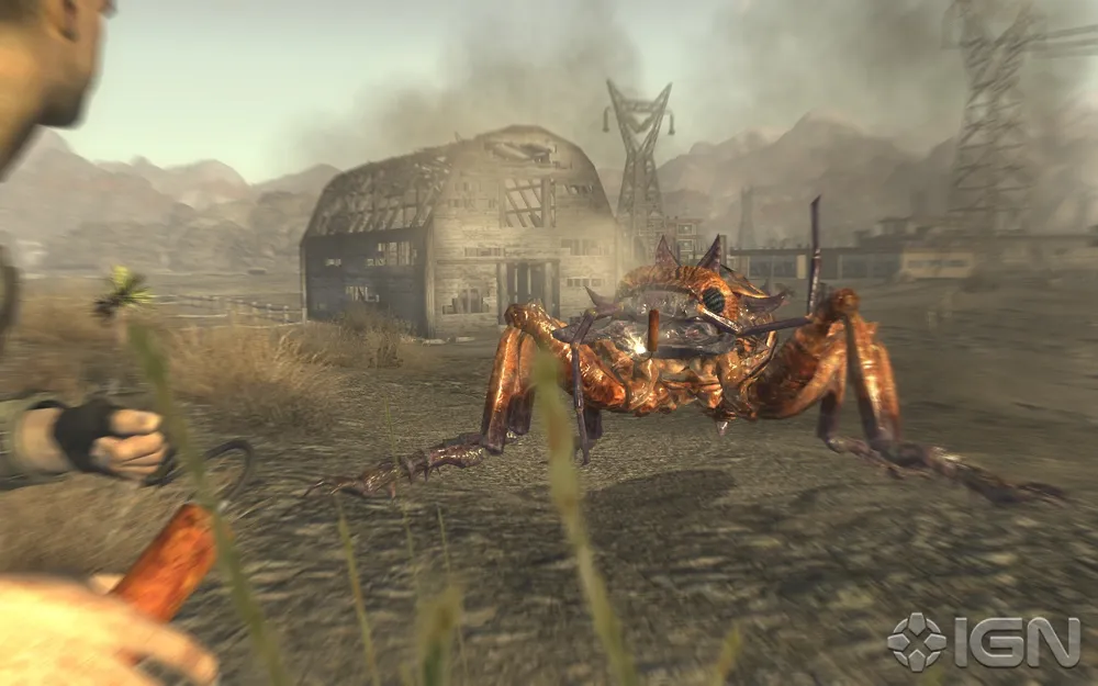 Первым, что мы отметили, стал скачок в уровне графики по сравнению с Fallout 3. Текстуры сделаны с любовью, игра выглядит красочно и четко. Мир создавался с повышенным вниманием к текстурам природы; поверхность камней, грунтовых и асфальтовых дорог, а также лица и одежда персонажей – все было переделано, и качество действительно заметно. То же можно сказать и о цветовой гамме, которая, оставаясь приглушенной, отдельными мазками накладывает цвета – особенно пурпурно-розовый цвет заката, инородно-зеленые тона богомолов, с которыми мы столкнулись позже, и неоново-желтые краски грозного радиоактивного перекати-поле. Мы серьезно.