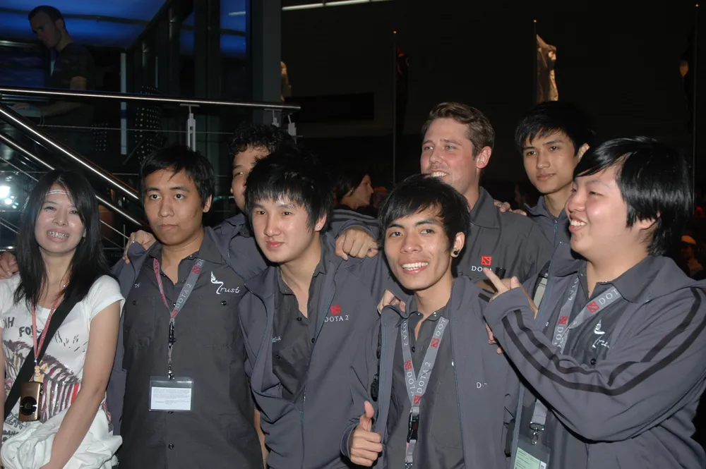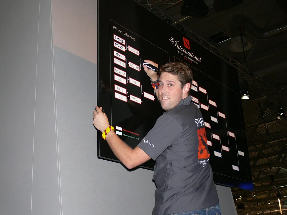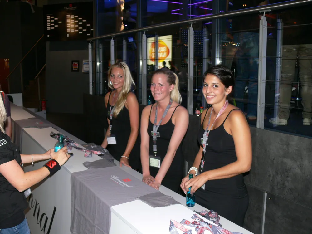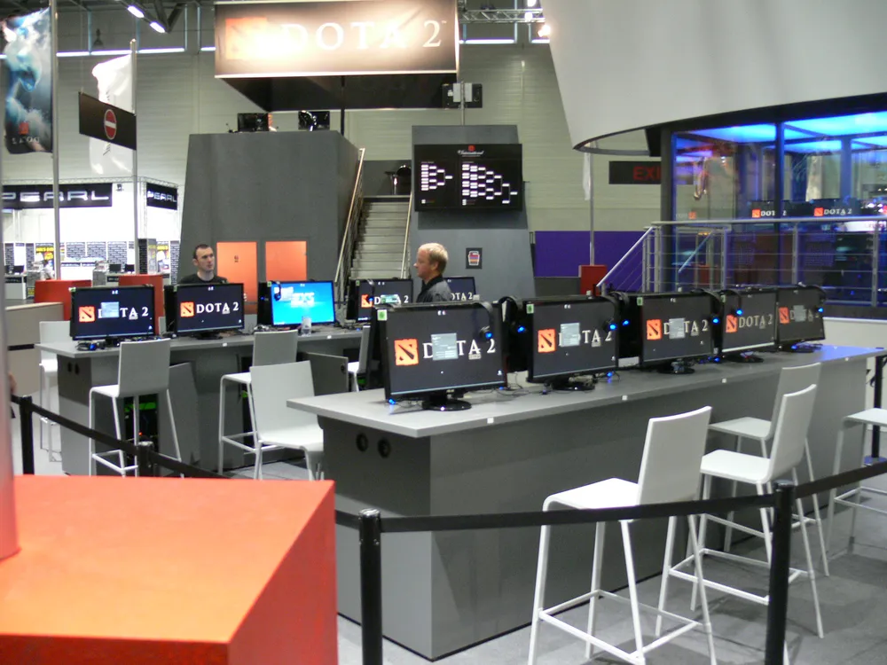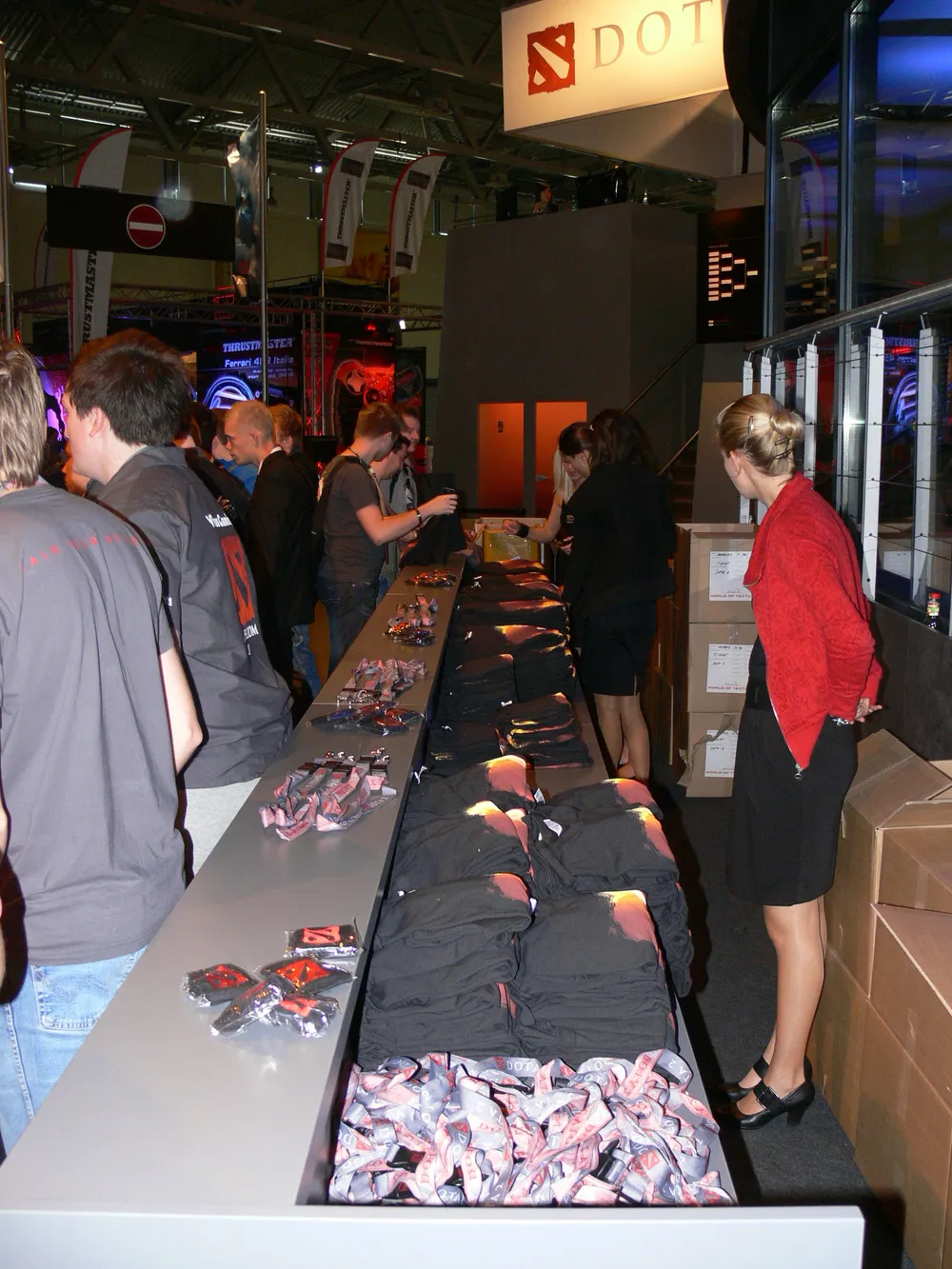 Девушки, раздающие халявные сувениры с символикой DotA 2