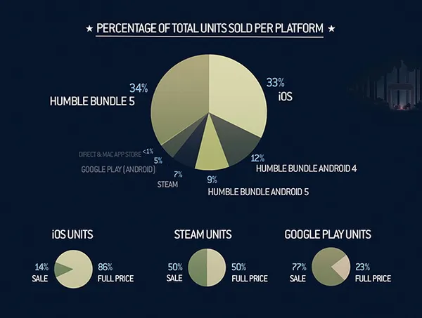 Sword & Sworcery вышла в 2011 году на iPad и с тех пор завоевала множество других платформ. 33% всех продаж проекта пришлись на iOS, 34% на Humble Bundle и только 7% — на Steam (при этом прибыль на Steam была больше, чем на Humble Bundle). В цифровом магазине Valve 50% копий продали по полной цене, а 50% — со скидкой.