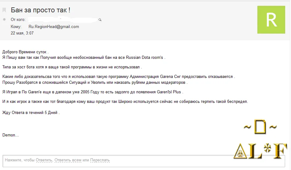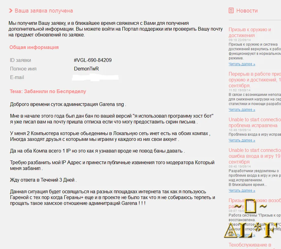 Ну щас спустя уже почти 5 месяцев с момента бана я делаю еще попытку восстановить свое Честное имя пользователя Garena а также попутно привлечь хоть к какой то ответственности того модератора который сотворил этот беспредел .