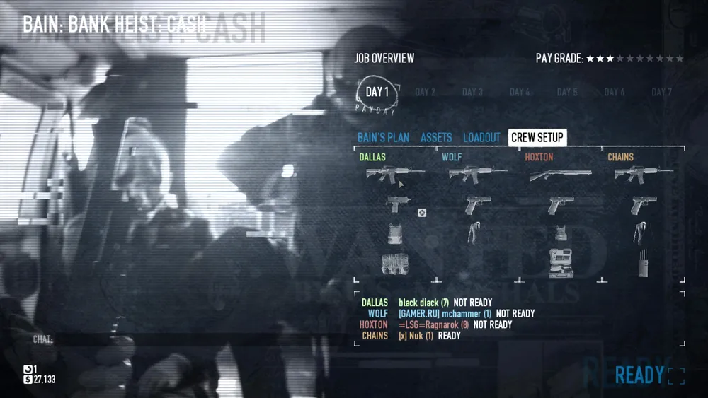 Здесь вы можете увидеть ваших сопартийцев, их одежду, оружие и маски. Можете купить оружие, модификации и поменять маску, если вам захочется. После выбора места ограбления вы можете увидеть план Бейна. Он скажет вам, что делать и что вы получите в случае удачного ограбления. После этого выбирайте оружие, предметы и броню, а потом жмите READY!