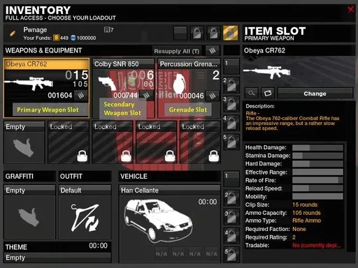 Далбкликните по слоту основного оружия и выберите то, которое Вы получили из первой посылки. Когда Вы заработаете больше денег или предметов за миссии, у Вас будет больше вариантов оружия и машин. Вы также можете выбирать машину в инвентаре.