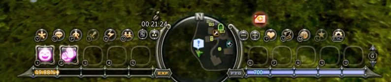 7) Снизу по центру располагаются панели умений (или смайлов в не боевом режиме), карта, шкала опыта, шкала FTG и основные функциональные кнопки.