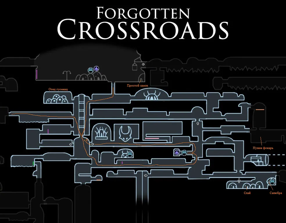 Максимально детальные карты можно посмотреть здесь. Мои версии сильно упрощены, но зато обозначены срезы (белые стрелки) и места, где нужны способности.