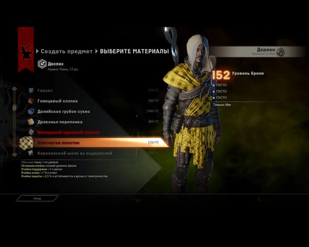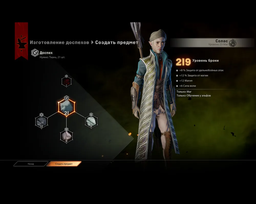 Обычные материалы тут не подойдут. Для отменной вещи необходимы «тронутые Тенью» металлы, кожи или ткани, которые попадаются случайным образом при сборе, а так же особые находки вроде драконьего зуба или железной коры. В ячейку можно вставить только одну единицу такого материала, но ее заполнение не является обязательным.