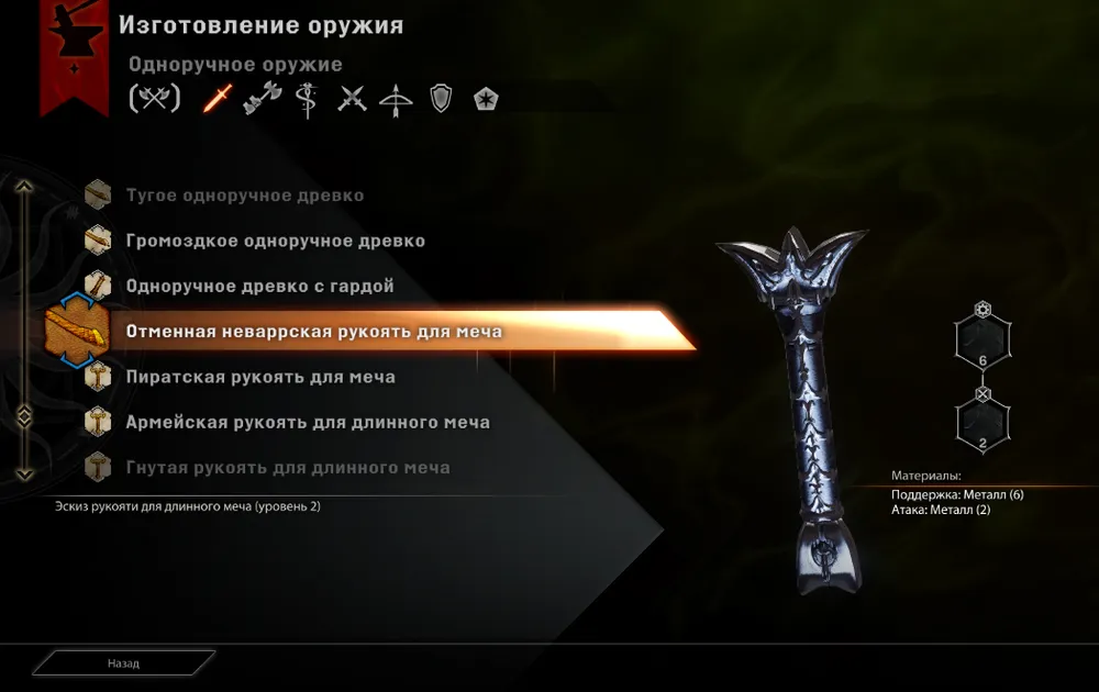 Существует три уровня эскизов. Чем он выше, тем больше содержит ячеек для материалов и их количества, и тем качественнее и с большим количеством бонусов можно создать предмет.