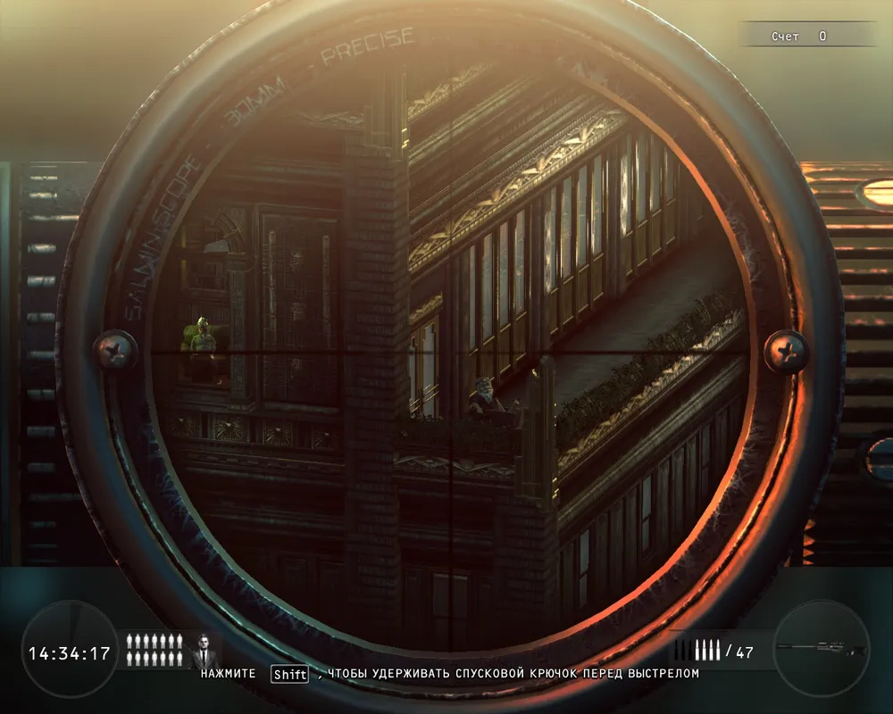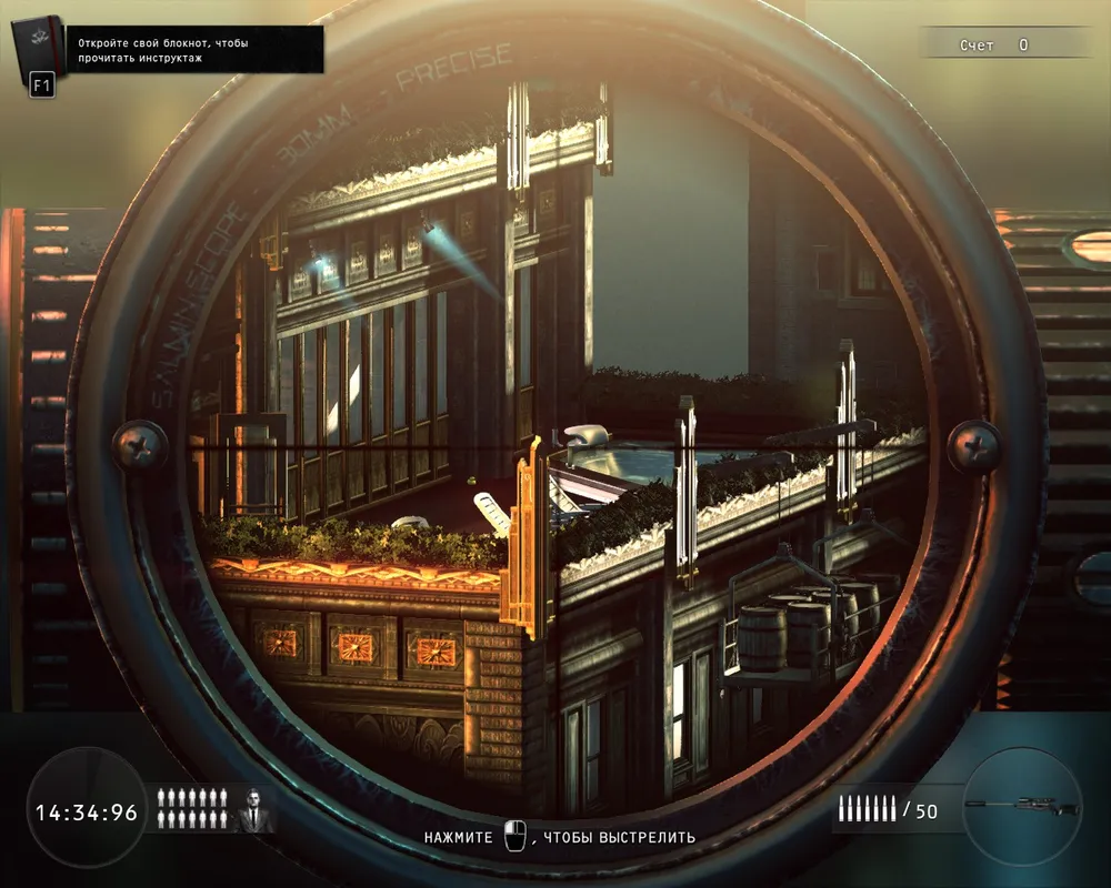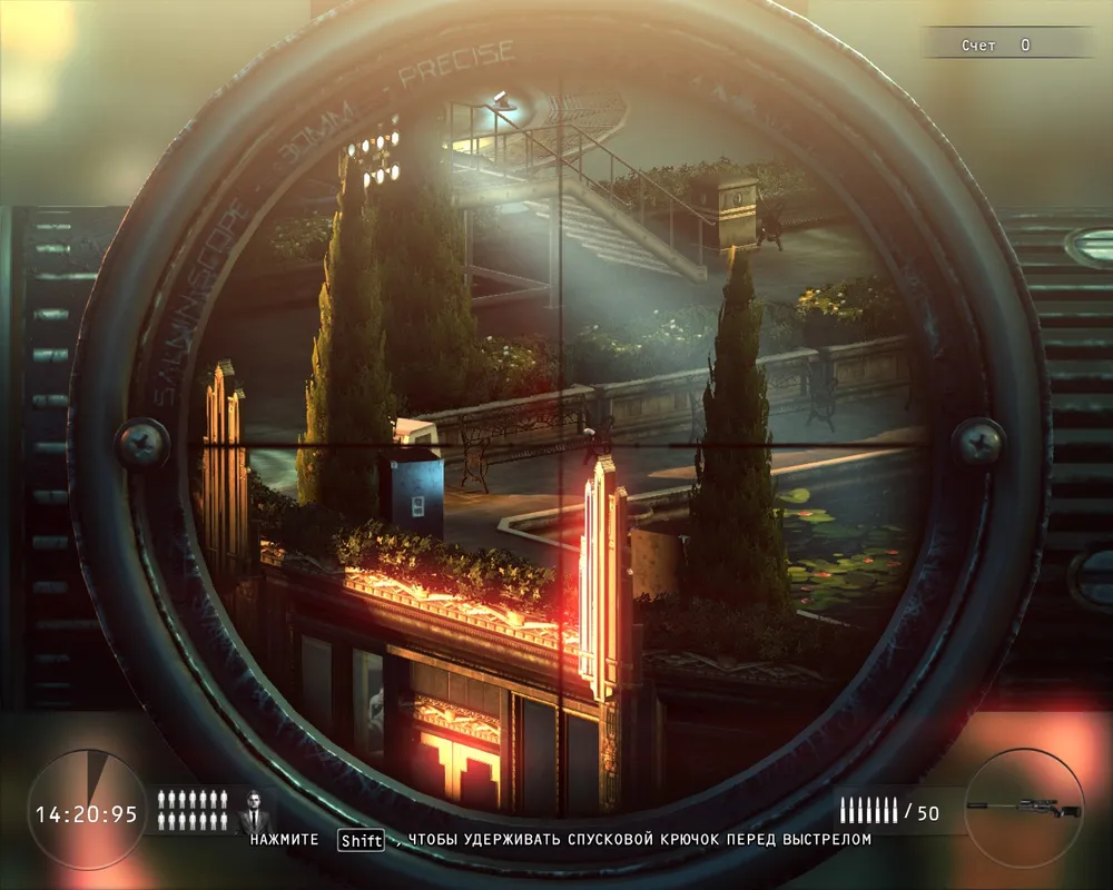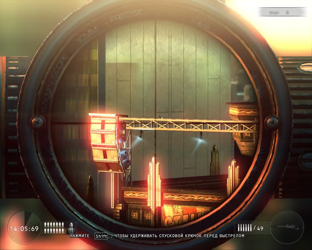 Тоже несложная ачивка. На скриншоте Хитман смотрит прямо на то здание, на котором находиться наша цель. Смотрите на правую часть здания и стреляйте по боксерской груше (не по человеку) и испытание пройдено!