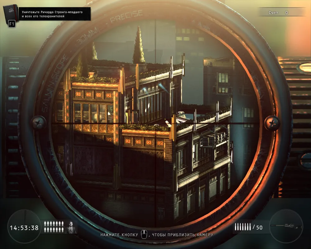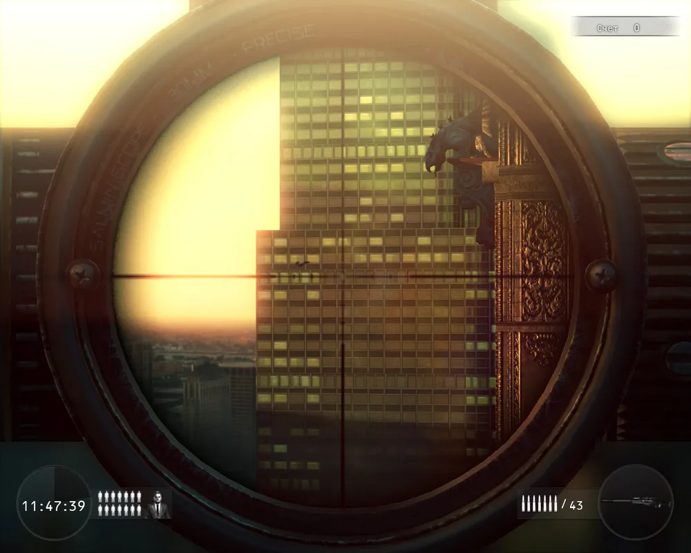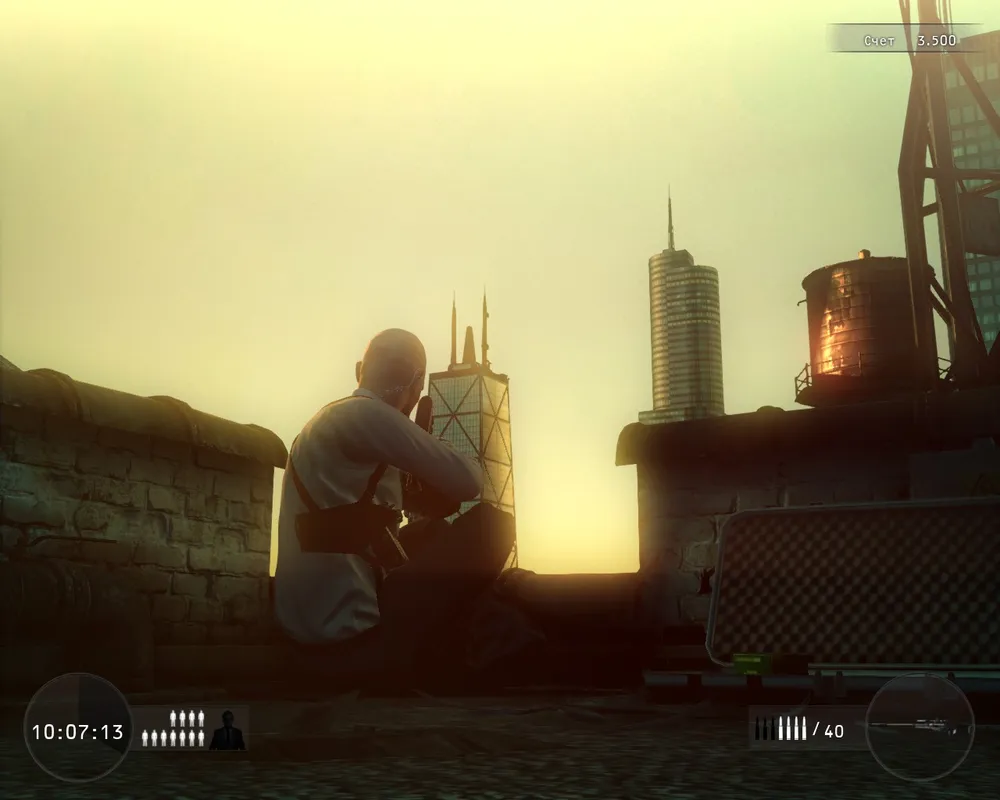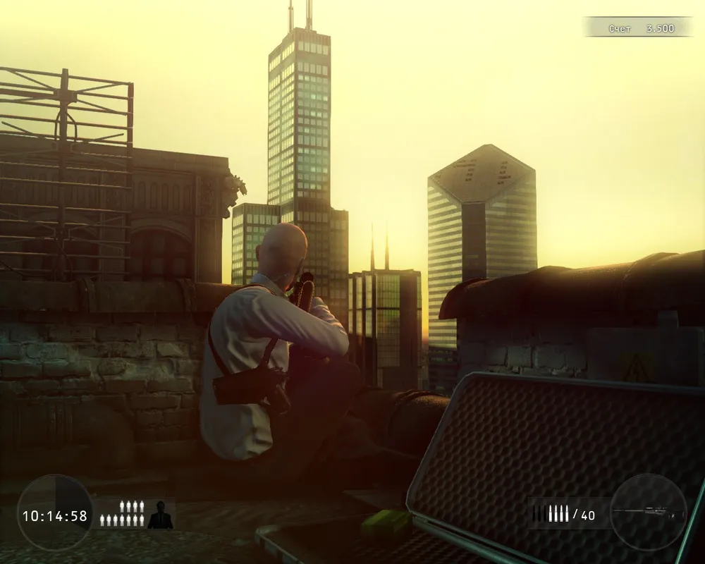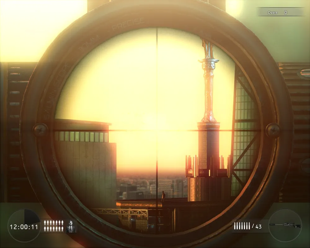 Вам надо убить человека, который находится на огромной высоте, почти на самой вершине здания со шпилем. На скриншоте Хитман сидит напротив этого небоскреба. Посмотрите на крышу и вы сами увидите цель.