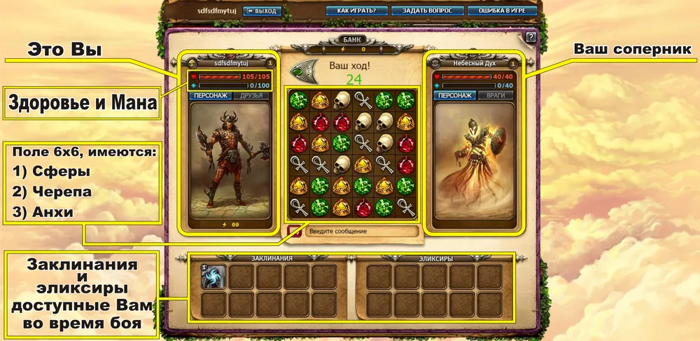 3) Урон - тут объясню. Лучшее объяснение это пример. Например у вас 150дмг(урона), вы ломаете 3 черепа(каждый из которых наносит 5 единиц урона) итого противник получает 165 единиц урона. Тоже самое происходит и с заклинаниями, если ваше заклинание базово наносит 10 единиц урона то с дмг150 вы ударите на 160 единиц. Правда я пока не разобрался прибавляется ли урон к следующему сбросу который происходит в рамках этого же хода т.е. я к примеру сломал сколько то черепов, сверху просыпались новые, построились в ряд, сломались, к ним дмг приплюсуется или это будет тупо кол-во черепов х5, если кто знает напишите плз.