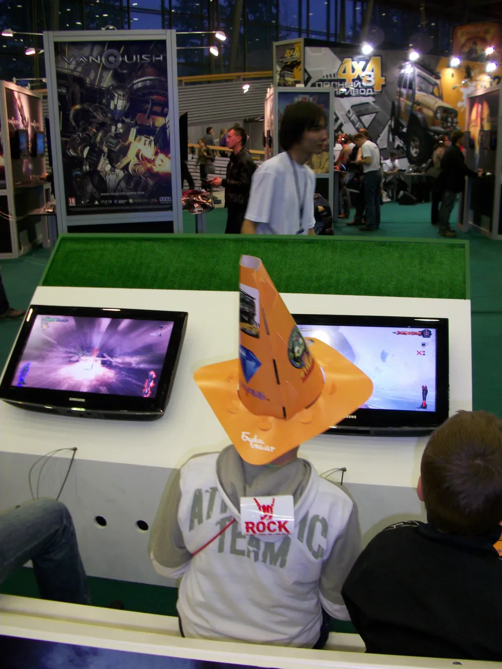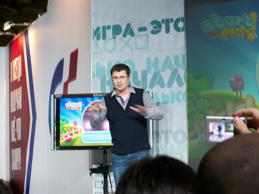 Присев отдохнуть на перилах, я заметил, поднимающуюся на сцену стенда Sony, смутно знакомую фигуру. Внезапно! Гарик Харламов поюморил пару раз, рассказал, что он заядлый геймер и продемонстрировал контроллер Move в игре, где надо ракеткой сбивать мух или что-то похожее на них.