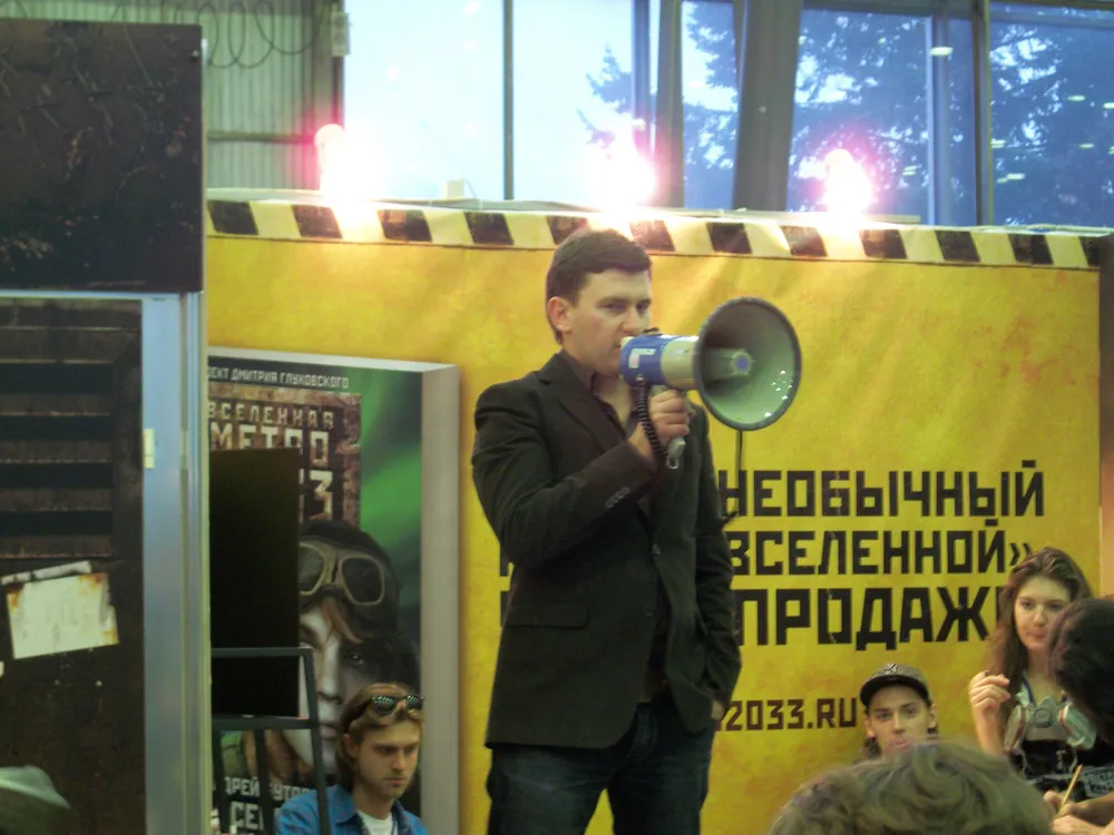 Дальше я стал тупо бродить по залу и внезапоно увидел Глуховского, орущего чего-то в мегафон. И уже здесь можно заметить некоторое количество vipнутой школоты. Зато для фанбоев подземки было раздолье - фоткайся, подписывай книжку, авось и руку пожмет.