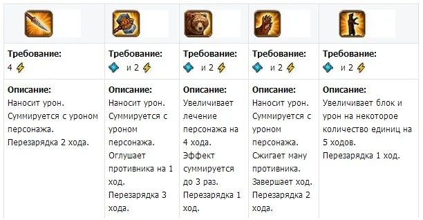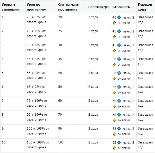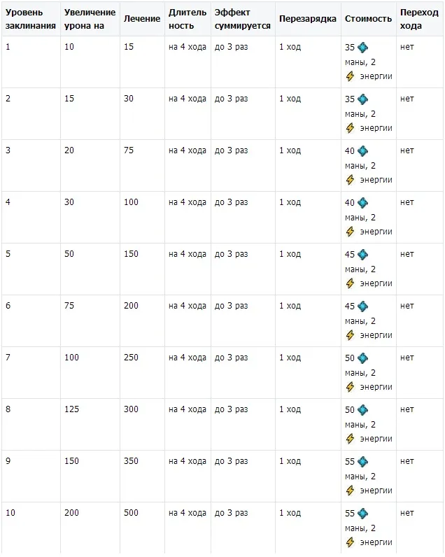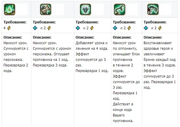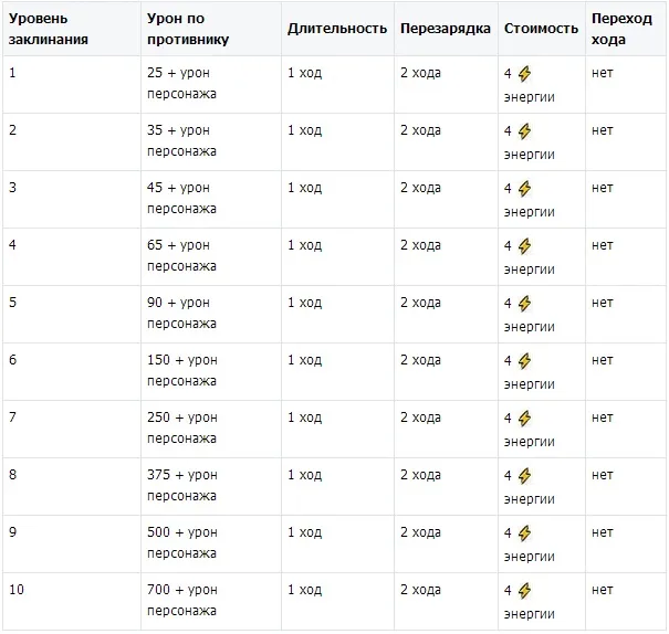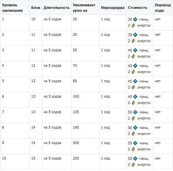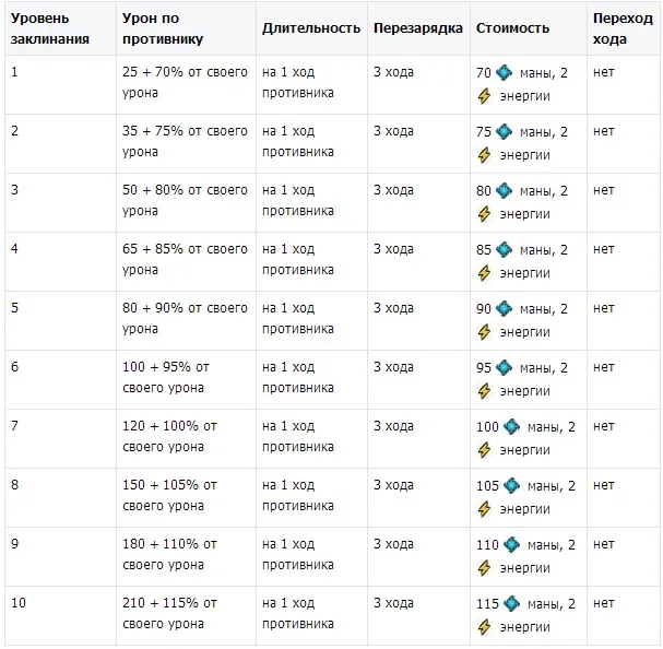 Продолжаем этот же пример. У нас сейчас третий ход - длит 2, стек 3. Четвертый ход - вначале длительность 1, стек 3. Если я не возьму сейчас укус змеи, то длительность к началу пятого хода останется 1 ,а как только сработает снятие блока, то все три укуса пропадают на 6-м ходу. Если же я на 4-м ходу снова беру укус, то все продолжается, как и ранее - длительность 2, стек -3. Более 3-х раз эффект не приплюснется, но продолжая пользоваться укусом, вы продлеваете действие от трех укусов постоянно, пока не прекращаете его использование. Максимальный урон, наносимый противнику при 3-х кратном использовании укуса для 10-го уровня равен 9000, а уменьшение блока на -30 единиц. Также хочу представить вам культовые заклинания ужасающих по уровням: