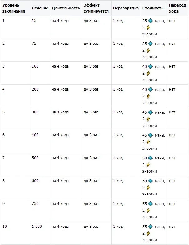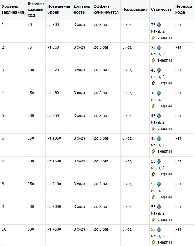 В отличие от ужаса, у защитника эффектом суммирования обладает только Тотем защитника, максимально можно повысить лечение до 3000 тысяч единиц, не плохо я вам скажу, особенно если этот закл прокачан до высшего уровня скажем на 7 или 6 уровне. Ну и также хочу представить культовые заклинания защитника по уровням: