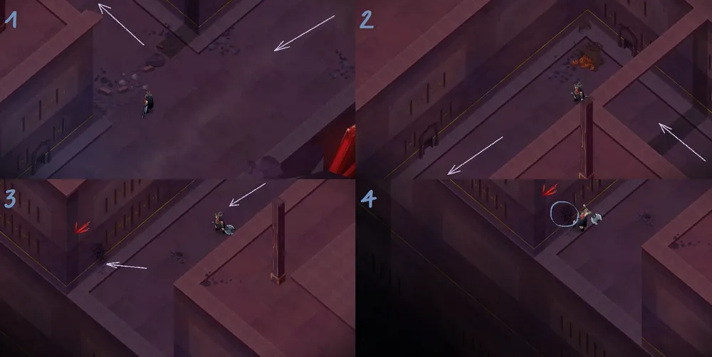 Тут наш путь раздваивается. Целесообразнее будет сначала идти прямо, а потом уже направо, но раз уж так вышло, сначала идём направо, к первой колонне. Чтобы её активировать, нужно ударить по ней сильной атакой.