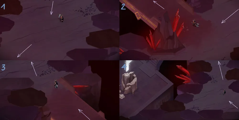 На этом участке с неба будут падать осколки, от них нужно уворачиваться, иначе нам нанесётся урон. Далее тоже будут такие участки, они отмечены красным восклицательным знаком.