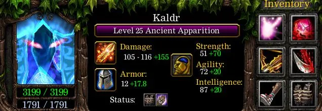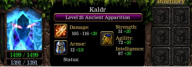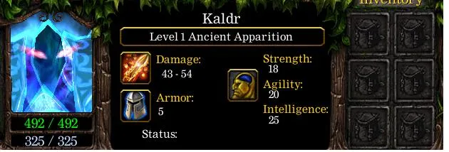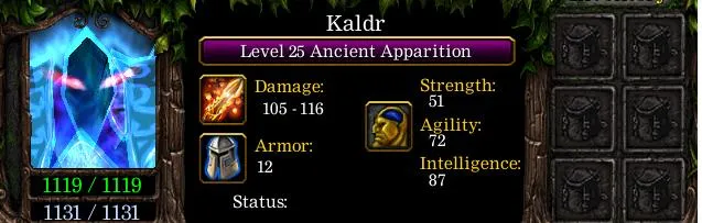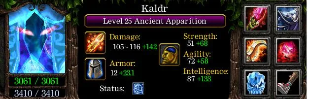 Описание: Калдр испускает мощный поток из града и темной магии. После произношения он должен использовать его еще раз, чтобы взорвать область в радиусе 200 там, где оказался этот поток. Наносит урон вражеским юнитам и накладывает на них проклятье мороза, которое уничтожает их регенерацию здоровья и убивает, если показатель их здоровья падает ниже определенного значения. В скобках урон с 25% сопротивлением магии.