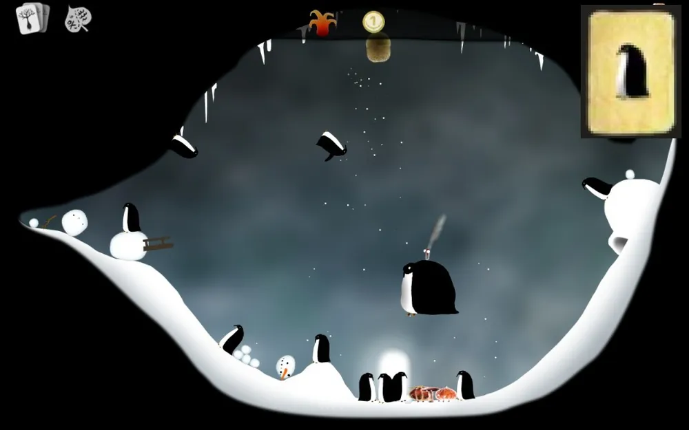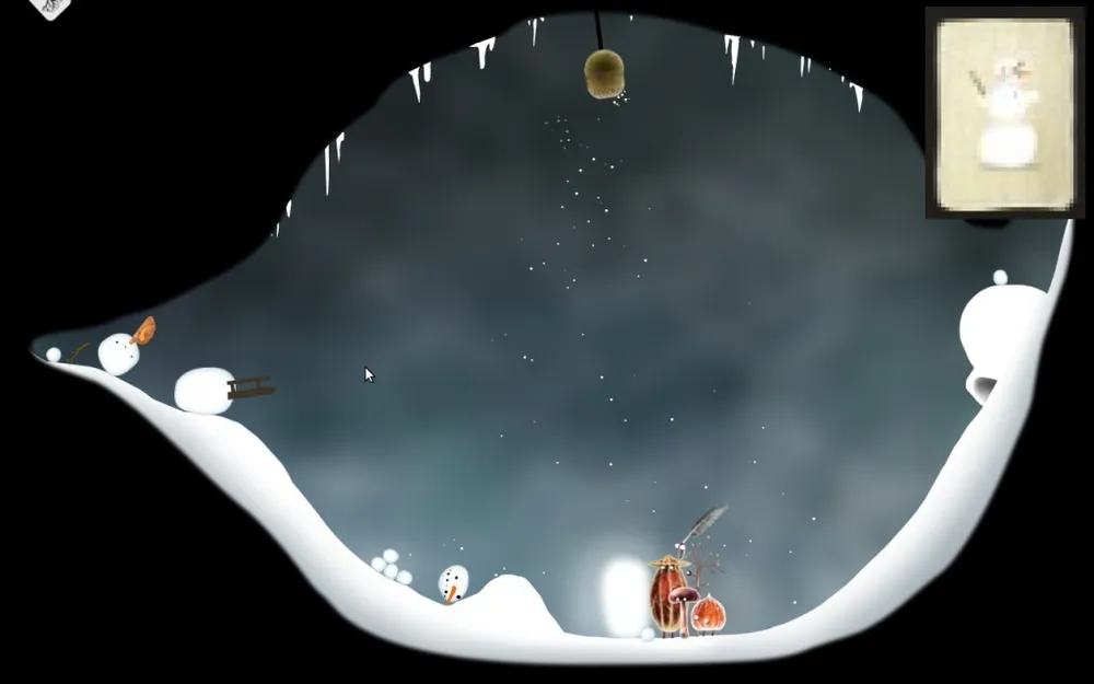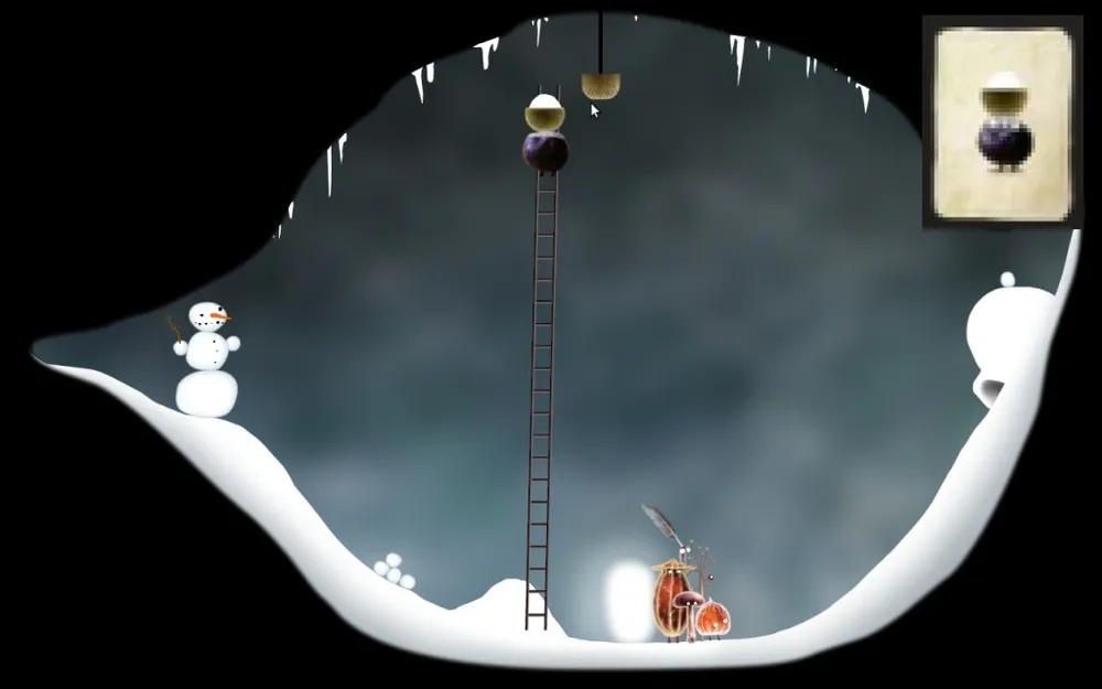 Действия и требования: Насыпать кучу снега, чтобы сани со страусом смогли разбить снеговика, стоящего на противоположной стороне.